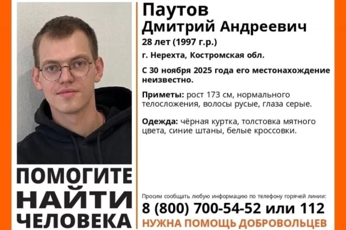 В Костроме продолжаются активные поиски 28-летнего Дмитрия Паутова, чьё местонахождение остаётся неизвестным с 30 ноября 2025 года. К поисковой операции теперь подключены беспилотники.