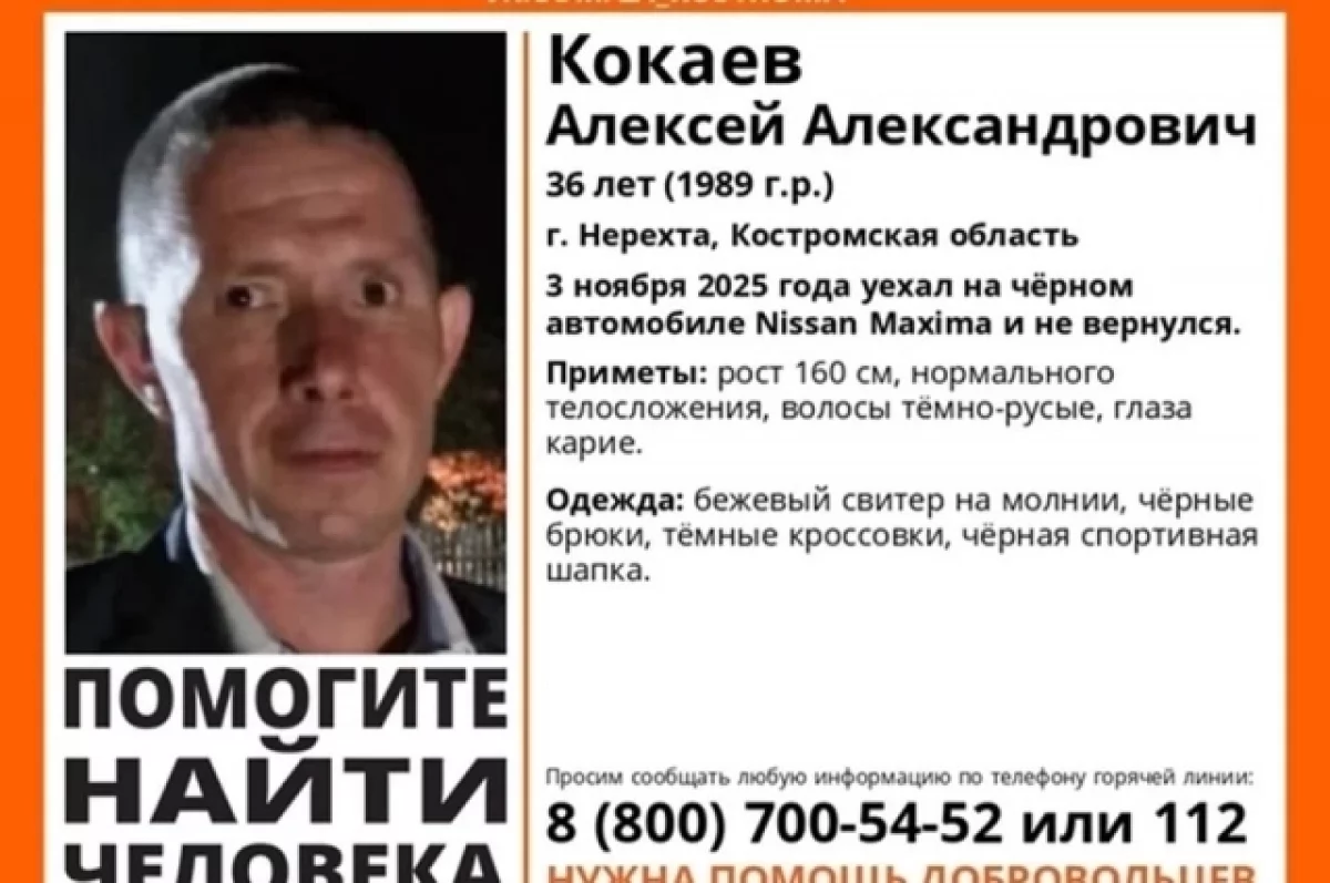 3 ноября в Костромской области пропал 36-летний Алексей Кокаев из Нерехты. Мужчина сел в чёрный Nissan Maxima и с тех пор не выходит на связь. Об этом сообщает «ЛизаАлерт». Его ищут уже четвёртые сутки.