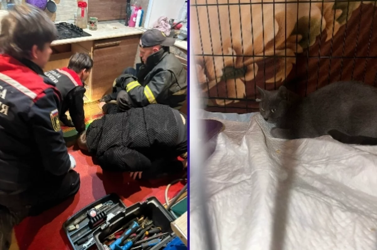 Костромские спасатели вызволили одичавшую кошку из-под кухонной мебели